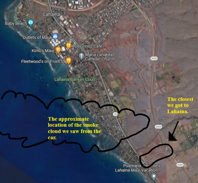 We made the decision to return to Kahului because we didn’t know the full extent of the situation.  In West Maui there was no cell signal or internet connection.  In Kahului we could regroup there, get back into communication with the family, and if it was just a wildfire, we could wait it out.  At this point, we didn’t know anything else.  The fire was only an hour or two old by then and we didn’t yet have any news.